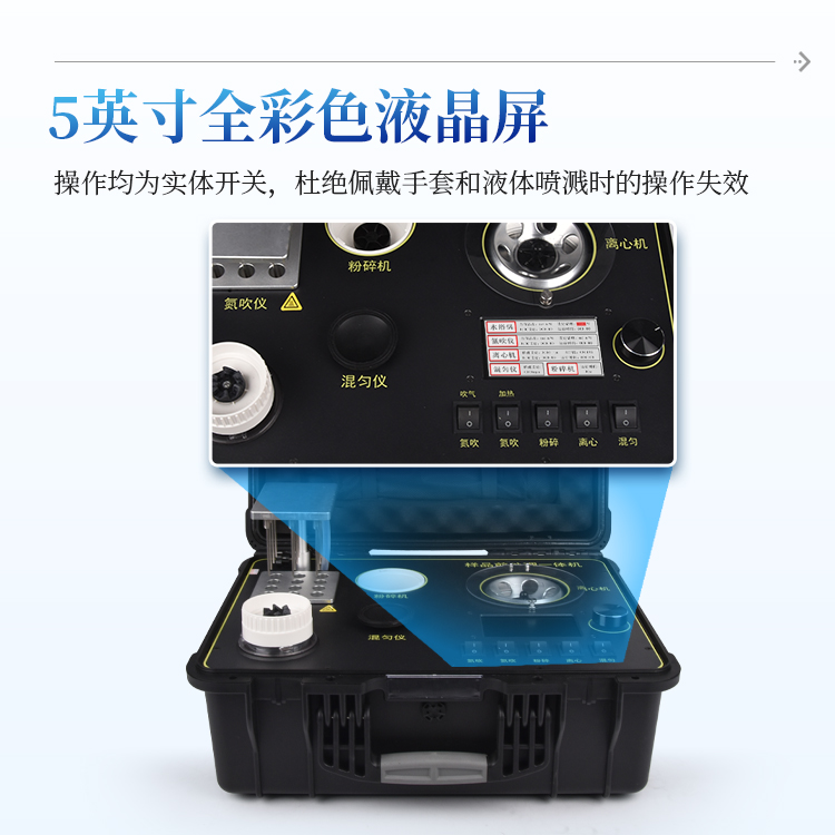 简要描述: 食品快检前处理一体机IN-QC4功能紧凑,集成四种样品前处理常用的功能,完成样品一站式处理。结构稳固,机箱采用高品质工程塑料,具备优秀的抗冲击性、耐腐蚀性、便携性。操作稳定,机器采用五寸全彩色液晶屏,功能指示性强,用户操作均为实体开关,杜绝佩戴手套和液体喷溅时的操作失效。